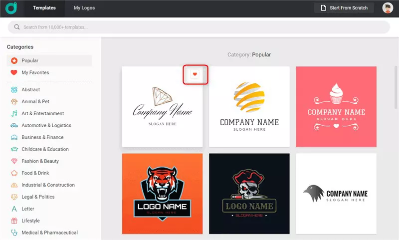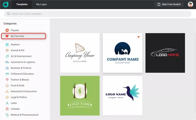 Click My Favorites option to view templates you liked. Click on any template to open it in the logo editor, and then customize it at will.