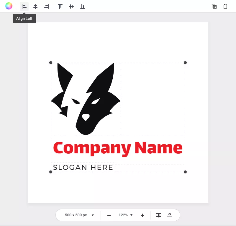 DesignEvo allows you to align multiple objects. Once select them, alignment buttons appear on the editing menu bar. Click any one of the buttons to align the objects left, center, right, top, middle, and bottom.