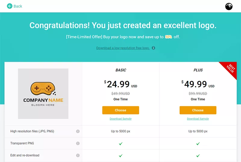 Sign up and sign in your account, and then click the Download button on the top toolbar to download your logo design. A free low-res logo is also available if you share DesignEvo on your social media, blog, or other website.