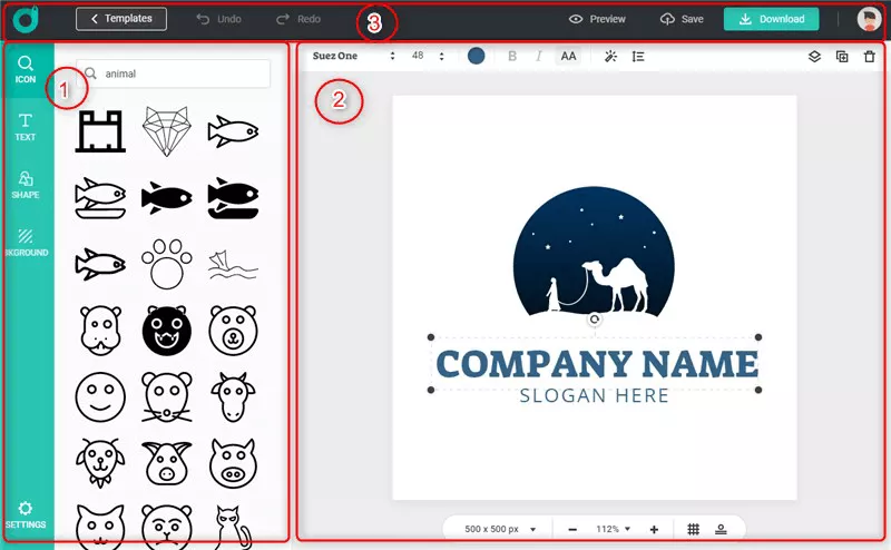 1. Elements: DesignEvo is equipped with an icon library, selected shapes, fonts, and background colors. By shifting the relevant tabs on the side panel, you can add different elements correspondingly.