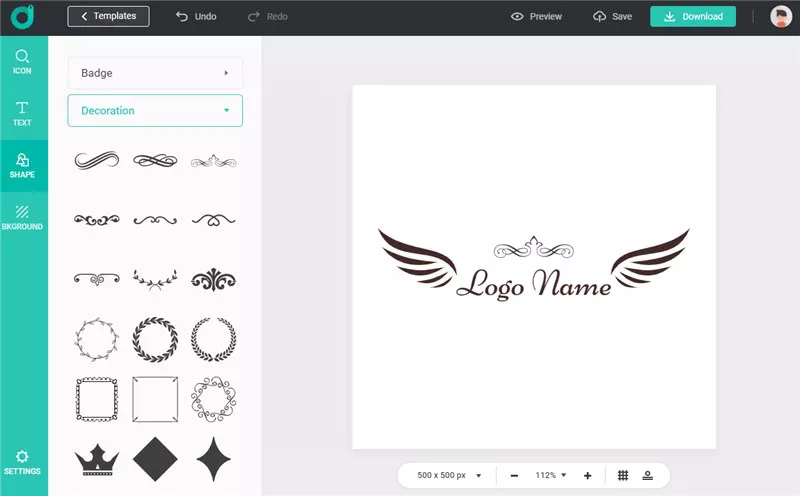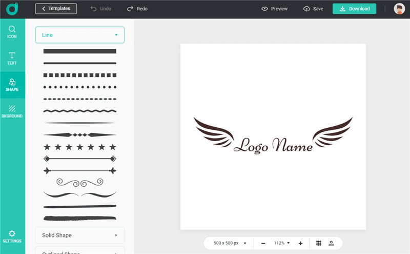 Besides the icon library, we also designed a batch of shapes for you so that you can easily find what you need, including Badge, Decoration, Line, Solid Shape, Outlined Shape, Banner, and Symbol. To show them, click on the Shape tab on the side panel.